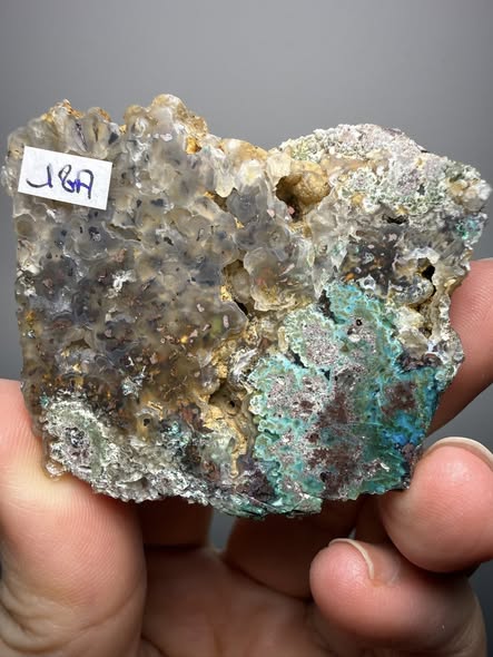 Chrysolcolla & native koper in Chalcedoon van de Bacan-eilanden uit Indonesië a