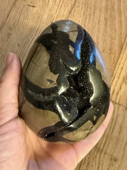 Septarie is een prachtige voedende kalmerende en aardende steen, de meest voorkomende is die uit Madagaskar. Deze bestaat uit geel calciet met een randje van versteend organisch materiaal en grijze kalksteen.