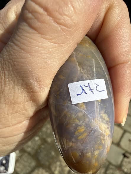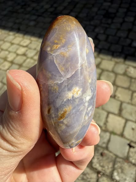 “Deze partij prachtig Paarse Chalcedoon uit Indonesië vertelt met dat zij een reflectie van de kosmos zijn. Het zijn mini-Galaxies in kleine stukjes op de Aarde. Hartegroet, ann”