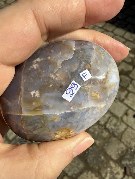 “Deze partij prachtig Paarse Chalcedoon uit Indonesië vertelt met dat zij een reflectie van de kosmos zijn. Het zijn mini-Galaxies in kleine stukjes op de Aarde. Hartegroet, ann”