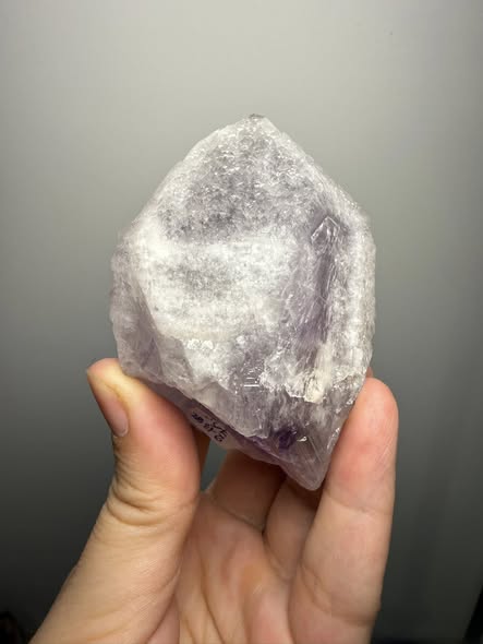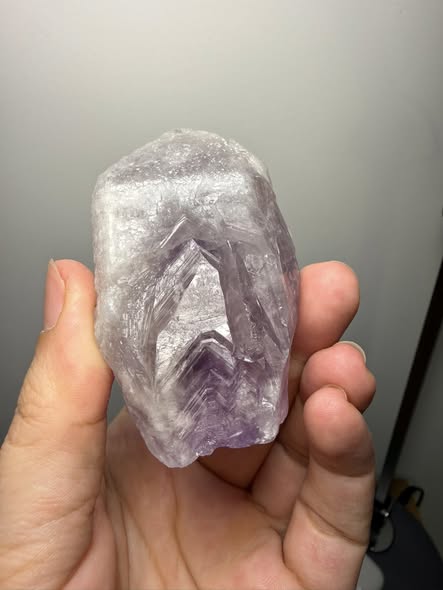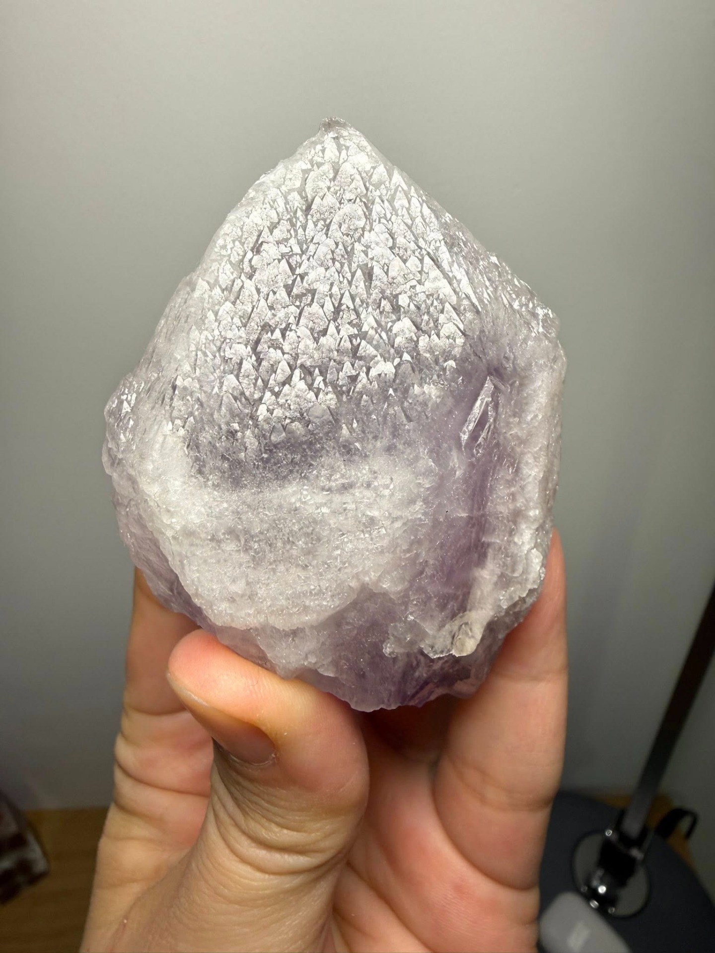 Dit is een nieuwe soort Amethist die heel recent in Brazilië is gevonden. Deze Amethist zonder naam noemt straks misschien 'trigonic Amethyst'. We zijn heel blij dat we deze in Het Huis van A mogen ontvangen. Deze grote kristallen zijn opgebouwd uit ontelbare driehoekige records en Bron-coderingen, ook wel barcodes genoemd, met dimensionale portalen.