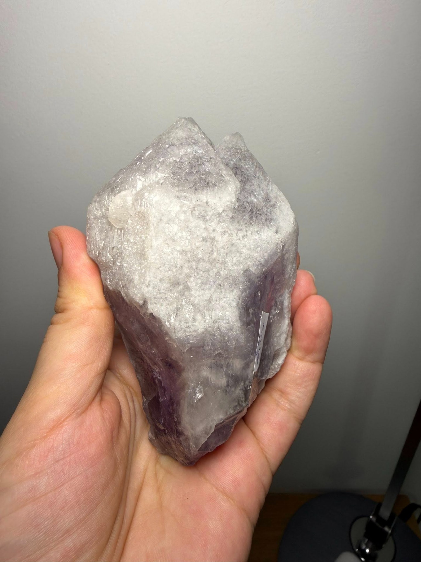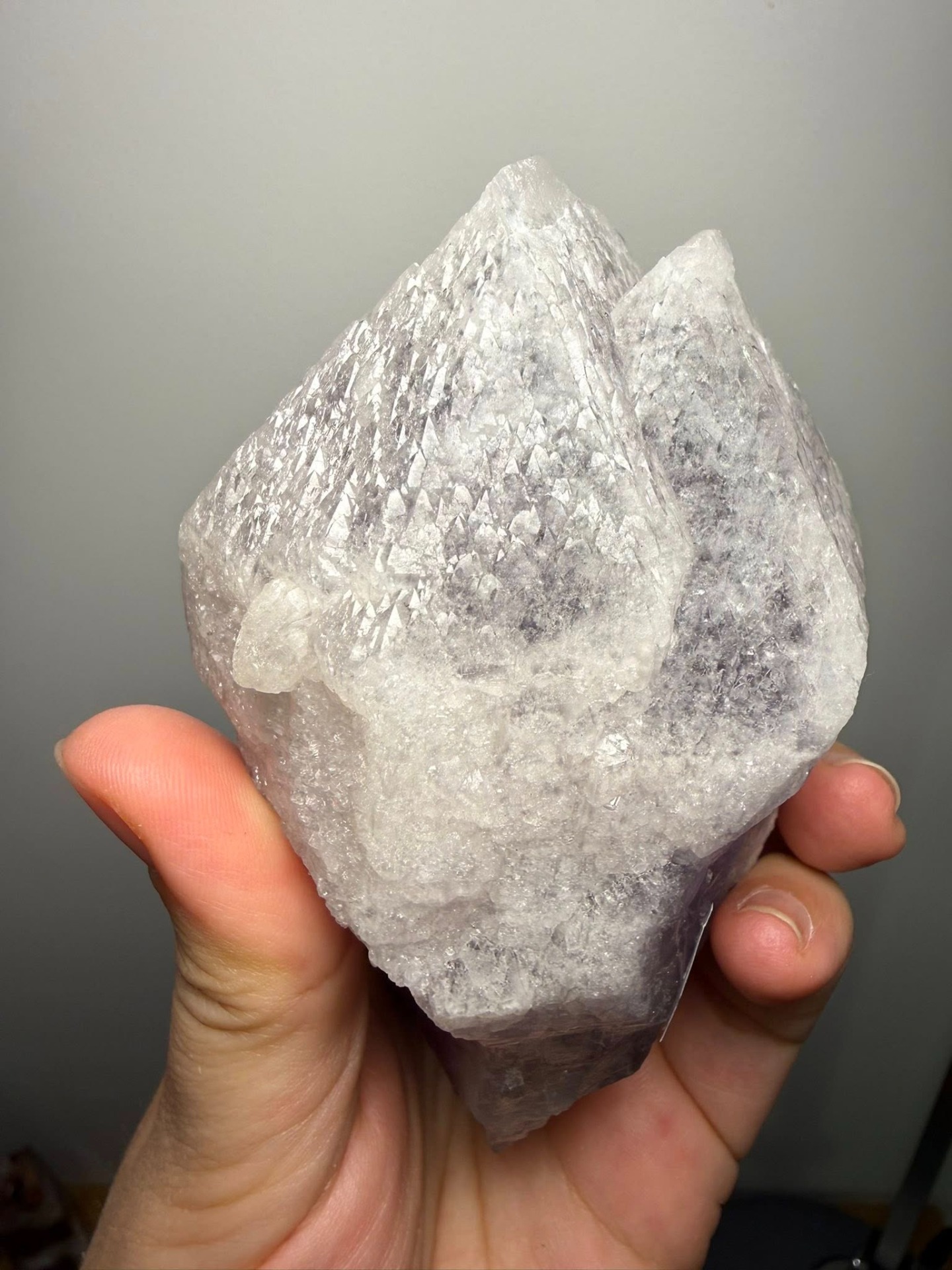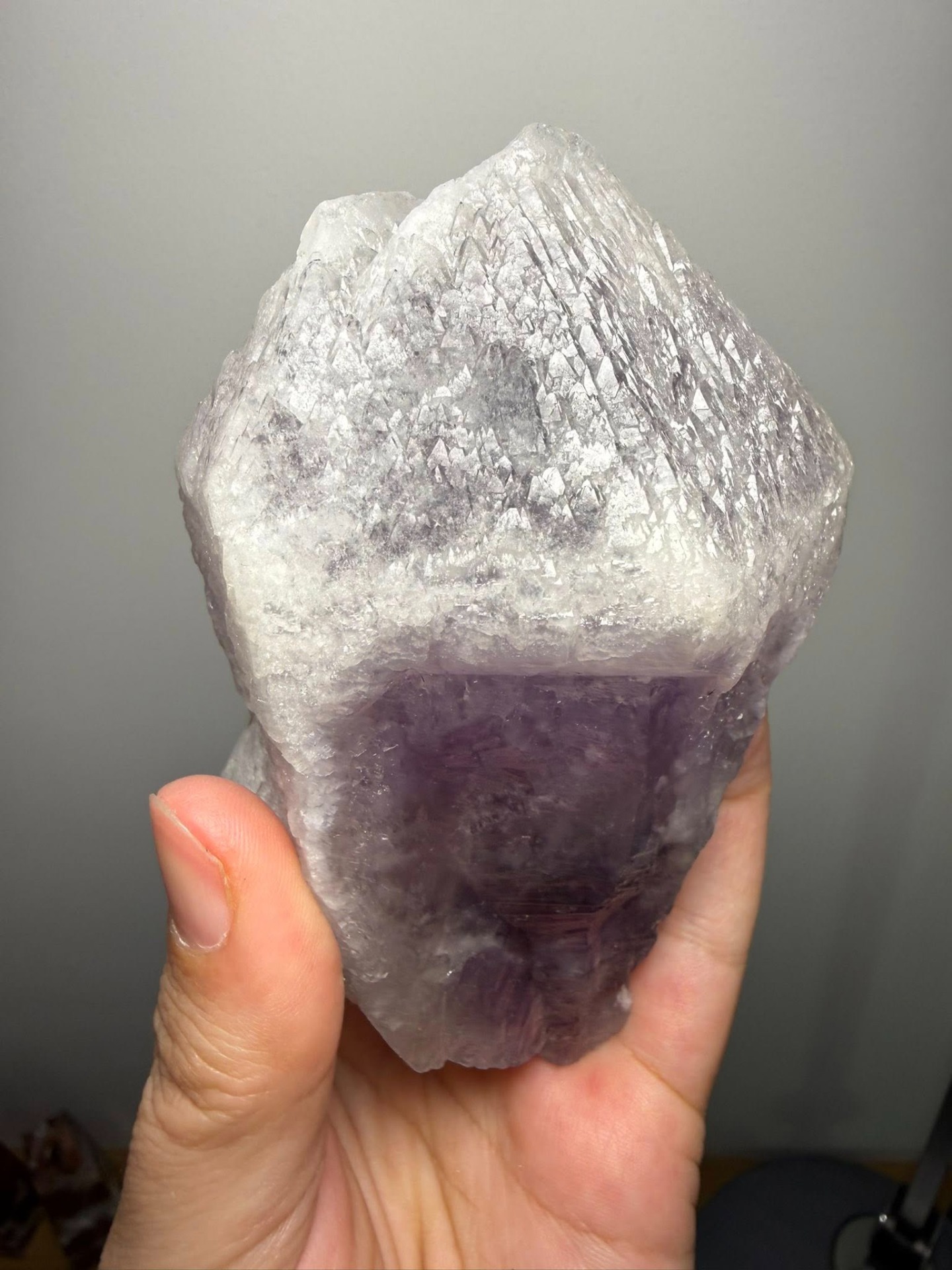 Dit is een nieuwe soort Amethist die heel recent in Brazilië is gevonden. Deze Amethist zonder naam noemt straks misschien 'trigonic Amethyst'. We zijn heel blij dat we deze in Het Huis van A mogen ontvangen. Deze grote kristallen zijn opgebouwd uit ontelbare driehoekige records en Bron-coderingen, ook wel barcodes genoemd, met dimensionale portalen.
